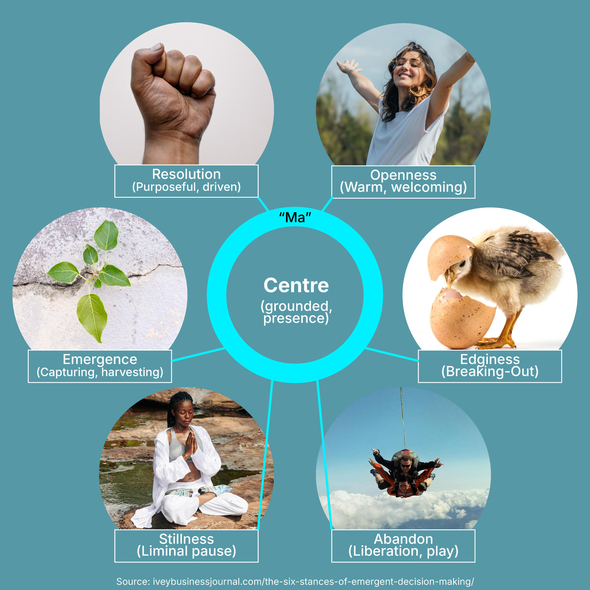 1) Arriving & Connecting: What is our Shared Intention?2) Accepting: What are we each bringing with us into this space?3) Going Deep: What are we feeling/sensing in our world today?4) Letting Go: What do we need to express, feel, and let go of?5) Presencing: Pausing (a “Ma”) for reflection, Intuition, & our felt-senses.6) Collective Insight- What new perspectives & insights have we gained?7) Letting Come: What are the possibilities that are surfacing/emerging?8) Harvesting: How will we now act - as a group and as an individual?9) Closing: The next step(s) forward.